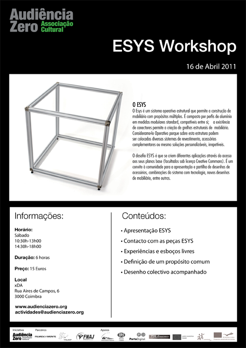 O Esys é um sistema operativo estrutural que permite a construção de mobiliário com propósitos múltiplos. É composto por perfis de alumínio em medidas modulares standard, compatíveis entre si; a existência de conectores permite a criação de grelhas estruturais de mobiliário. Consideramo-lo operativo porque sobre esta estrutura podem ser colocados diversos sistemas de revestimento, acessórios complementares ou mesmo soluções personalizáveis, irrepetíveis. O desafio ESYS é que se criem diferentes aplicações através do acesso aos seus planos base (facultados sob licença Creative Commons). É um convite à comunidade para a apresentação e partilha de desenhos de acessórios, combinações do sistema com tecnologia, novos desenhos de mobiliário, entre outros.